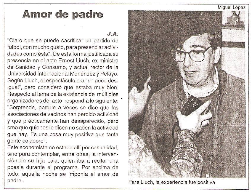 El fotógrafo me dijo que nos había hecho algunas fotografías por si decidía poner su imagen en el reportaje. La cámara era analógica y habría que esperar a revelar el negativo para que alguien del periódico nos dijera quién era aquel señor conocido. La periodista Cristina Fallarás, por aquel entonces directora del periódico y de la Editorial Ediciones Improbables, nos comentó unos días después tras ver los negativos a contraluz que el personaje en cuestión era el mismísimo Ernest Lluch y me propueso hacer un despiece o un destacado dentro de la crónica sobre el maratón de teatro. Así surgió este texto que firmé con el título de ‘Amor de Padre’.